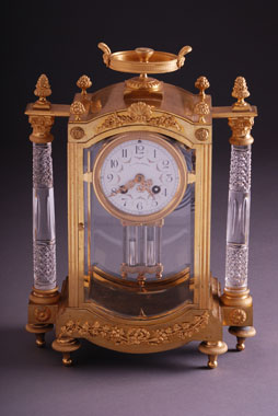 Francuska, polovina XIX veka. Telo sata je od pozlaćene bronze sa karakterističnom ornamentikom za period: girlande, vinova loza i palmete. Na vrhu antička posuda sa ručkama. Bočni kristalni valjkasti stubići sa korintskim kapitelima od bronze. Šlifovano staklo na sve četiri strane tako da se vidi mehanizam. Klatno sa živom. Porcelanski brojčanik sa iscrtanim vencima cvetića. Otkucava na pola i pune sate. Radionica: Leon Delaplace, Caen ispisano na brojčaniku. Mehanizam: VCMB. Dimenzije: 36 x 26 x 14 cm