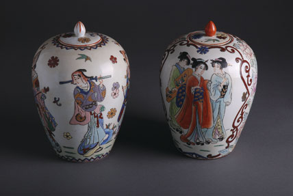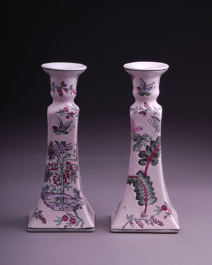 Kina, Period Cara Tungh Chih, oko 1870. godine. Svećnjaci izrađeni u karakterističnoj kakademon formi. Roze podloga oslikana motivima egzotičnog bilja i leptirima. Visina: 21 cm
