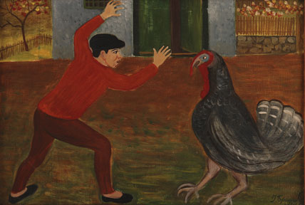 Ulje na platnu, 74 x 54 cm 1966, sign. Jedan od rodonačelnika i najznačajnijih predstavnika naivne umetnosti kod nas, koji je u najvećem delu opusa slikao prizore svakodnevnog života na selu. Najpoznatiji je po izvanrednom osećanju za kolorit. U njegovim slikama je ta ruralna svakodnevica oživljena izrazitom hromatskom gamom koja pleni pogled i posmatrača privlači istim intezitetom kao i smisao naslikanog prizora.
