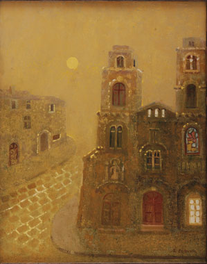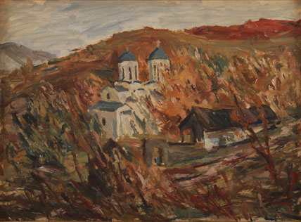 Ulje na kartonu, 34 x 52 cm 1952. Ovu sliku radio je naš poznati karikaturista, koji se, budući da je bio i školovan slikar zainteresovan za slikarstvo, rado bavio slikanjem pejzaža, naročito kada se u njima javlja i neka od naših srednjevekovnih crkava. Tada je kroz uravnoteženo plasirane hladne, pretežno plavičaste tonove, umeo da ispolji lepu, iskrenu starinsku osećajnost pred veličinom svog motiva.
