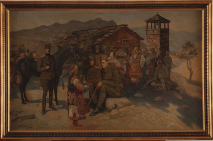 Ulje na platnu, 62 x 100 cm 1920, sign. Kao ratni slikar, učestvovao je u Prvom svetskom ratu kao dobrovoljac u srpskoj vojsci, što pokazuje i obrađena tema ove slike. Nastala po završetku rata, slika je izvedena u realističkom stilu, skoro fotografske preciznosti (lica i uniforme oficira i vojnika), rasvetljene bogate palete, sa odlikama poetike plenerizma.