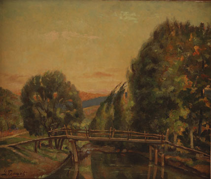 Ulje na platnu, 53 x 60 cm Oko 1940, sign Ova izvanredna slika izvedena je u maniru realističkog stila. Siže-srbijanski pejzaž ostvaren je u čvrstim formama, u kompoziciji koja je podeljena na horizontalne planove. Bujna vegetacija ovog predela sočnog zelenog kolorita, sa akcentima crvene boje, prati čvrste forme mosta u prvom planu i široko nebo i planine u pozadini, sve osvetljeno sa mnogo svetlosti.