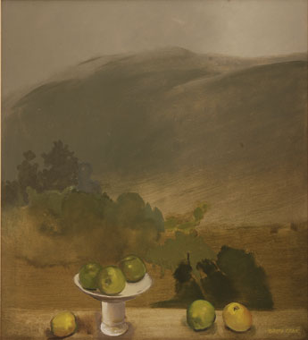 Ulje na platnu, 71 x 80 cm 2003, sign. Omiljeni motivi ove beogradske slikarke su pejzaži, znalački slikani u specifičnoj izmaglici. Poetski ona dočarava atmosferu, jedinstvo vazduha, neba i motiva mrtve prirode.