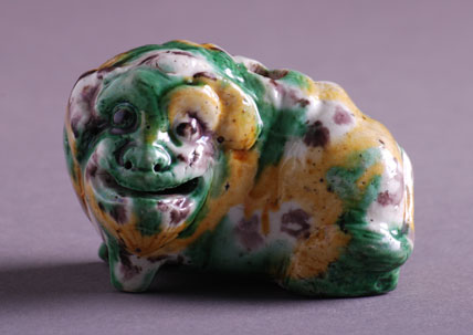 Kina, Qing dinastija. Kangxi (1662-1722). Apstraktna predstava mitske životinje u ležećem položaju, sa malim okruglim otvorom na leđima. Oslikana razlivenim bojama. Dužina: 9 cm