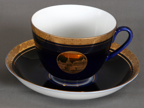 Porcelan, kobalt sa pozlatom, LFZ (Lenjingradski Farforovi Zavod). 1.kvalitet.Pozlatom “Moskva” i panorama Kremlja. Visina šoljice: 7 cm, prečnik tacnice: 15 cm. ( 6 kom.)