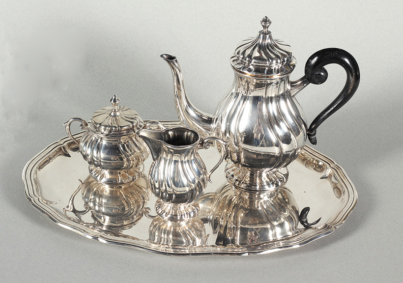 Nemačka. Žigovi: kruna i polumesec. Težina: 925 gr. Dužina poslužavnika: 35 cm, visina čajnika: 20 cm.