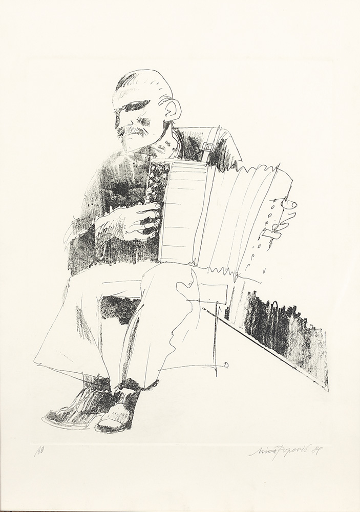 Olovka na hartiji, 30x30 cm. 1969. Sign. Navedeno pod br. 346 na str. 259, Katalog Mića Popović, Sreto Bošnjak, Beograd, 1994.