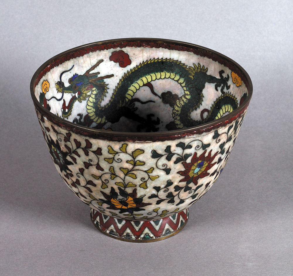 XVII vek. Metal, email, klozone tehnika Dimenzije: 15,5x21,5 cm Zdela je, verovatno, izrađena u radionici za carski dvor i višu klasu s obzirom da su zmajevi predstavljeni sa 5 kandži (prstiju).