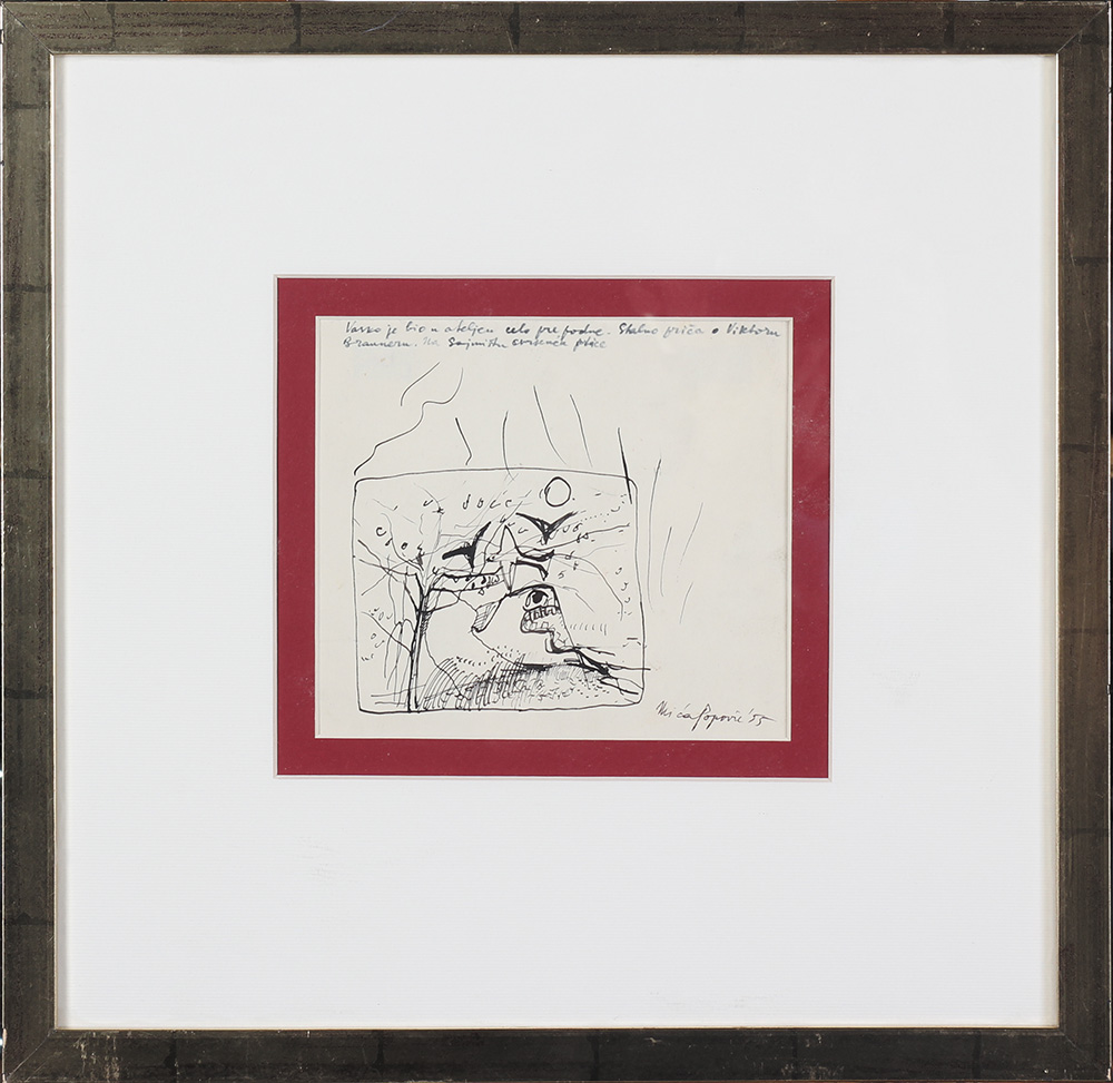 Flomaster i tuš na hartiji 15,5x17,7 cm 1955. Reprodukovano pod br. 173 na str. 54, Katalog Mića Popović, Sreto Bošnjak, Beograd, 1994.